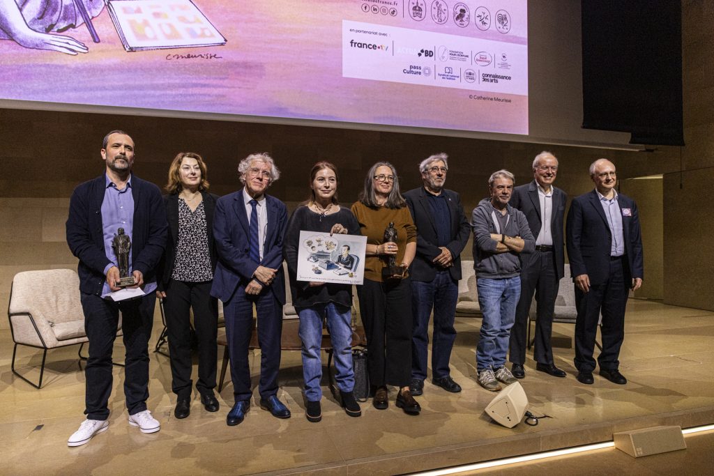Un jury prestigieux et exceptionnel était composé des membres des cinq académies présidé par Anne Goscinny: Bérengère Dubrulle et Patrick Flandrin, membres de l’Académie des sciences, Thierry Groensteen, correspondant de la section gravure et dessin de l’Académie des beaux-arts, Emmanuel Guibert, membre de l’Académie des beaux-arts, Dominique Michelet, membre de l’Académie des inscriptions et belles lettres, Pascal Ory, membre de l’Académie française et Jean-Robert Pitte, membre de l’Académie des sciences morales et politiques.